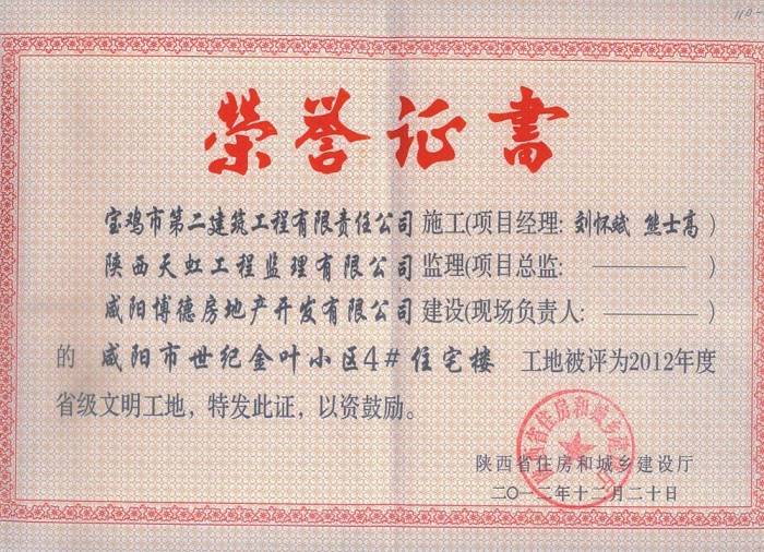 2012年度省級(jí)文明工地(世紀(jì)金葉小區(qū))